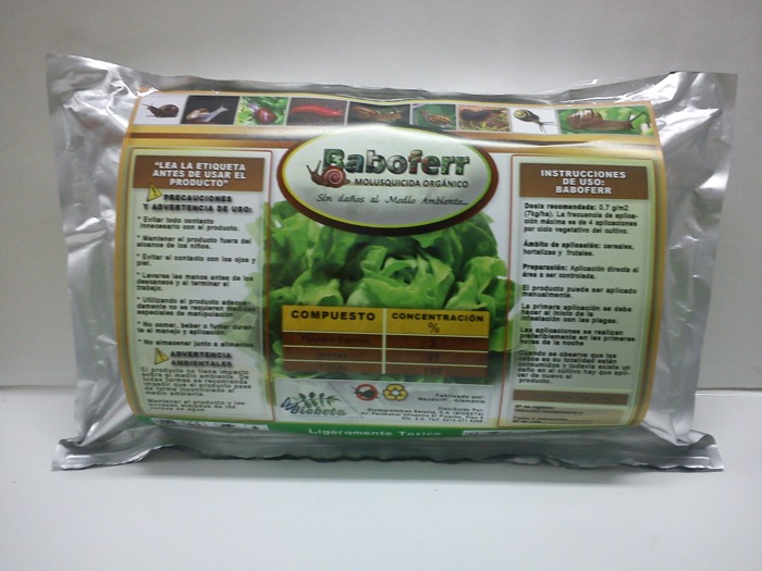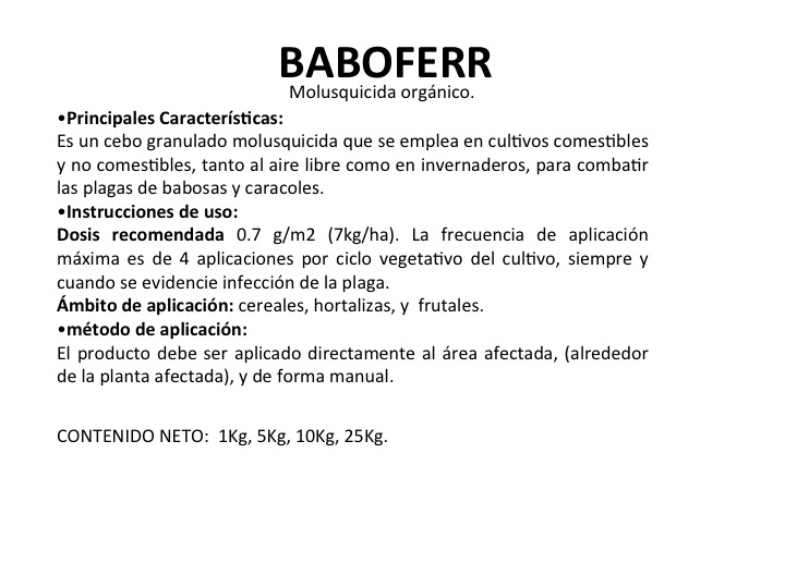 Es un cebo Granular molusquicida que se utilizar para el control de Babosas y Caracoles, compuesto a base de Fosfato Inorgánico no volátil poco soluble en agua. Este producto interfiere en el metabolismo de las babosas y caracoles afectando sus intestinos, paralizando su alimentación inmediatamente. Baboferr es totalmente amigable con el ambiente ya que se degrada por acción de los microorganismos para ser transformado en fosfato y hierro para el suelo. Actúa solamente contra los caracoles y Babosas, y no tiene ningún riesgo para el resto de los animales domésticos.